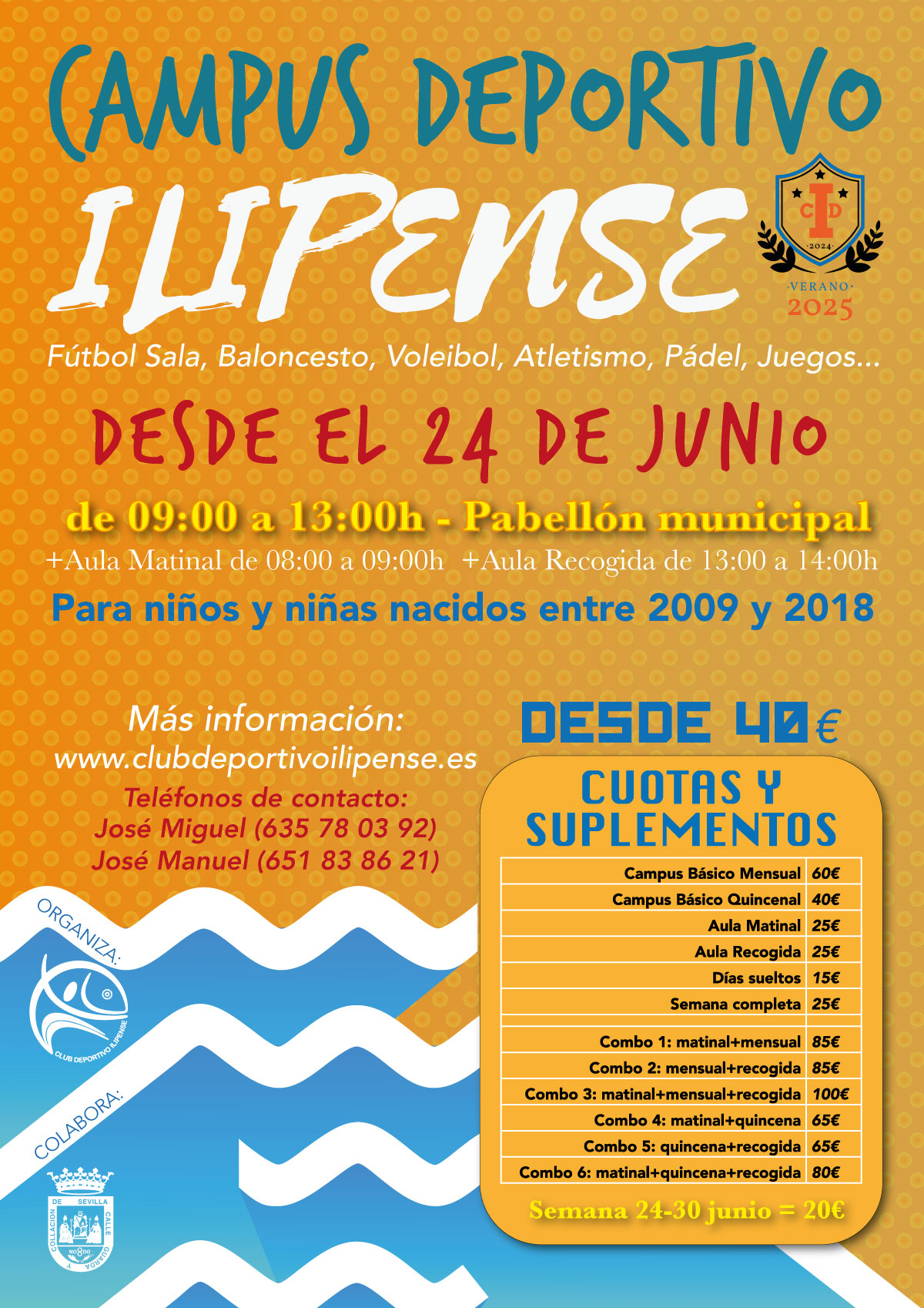 La alegría, el deporte y la recreación están de vuelta con el IV CAMPUS DEPORTIVO DE VERANO del CD ILIPENSE. A partir del 24 de junio iniciaremos de nuevo a esta actividad de verano, un programa de conciliación familiar y laboral que permite a los más pequeños de la casa disfrutar de la práctica deportiva durante la época estival.